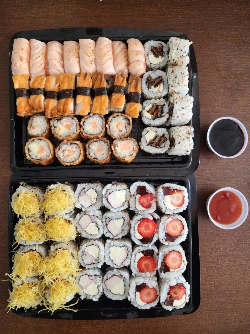 8 Futomaki Califórnia Salmão, 8 Kani Kama, 8 Shake Maki, 8 Kappa Maki, 2 Hossomaki Jow Salmão. Acompanha: 4 sache de shoyo, 2 hashi, 2 nozoki