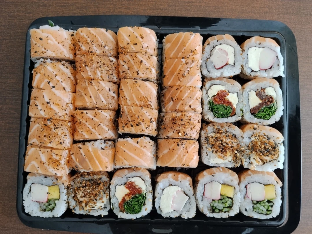8 Futomaki Califórnia Salmão, 8 Kani Kama, 8 Shake Maki, 8 Kappa Maki, 2 Hossomaki Jow Salmão. Acompanha: 4 sache de shoyo, 2 hashi, 2 nozoki