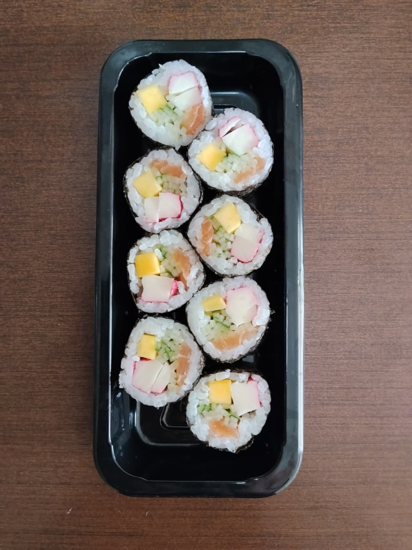 8 rolinhos recheados com kani kama, pepino, manga e salmão. (Acompanha 1 hashi, 1 nozoki, 2 sachês shoyo)
