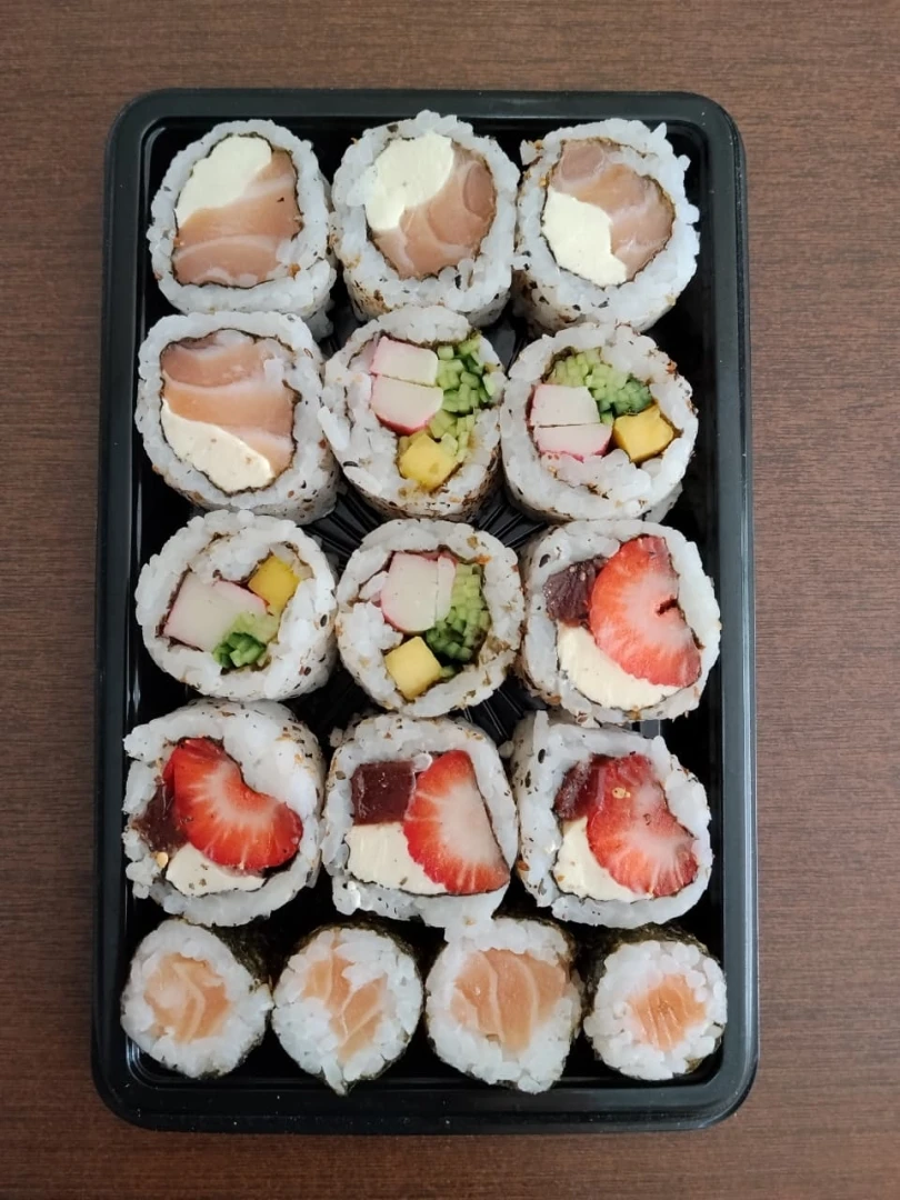 4 Uramaki Filadélfia, 4 Shake Maki, 4 Uramaki Califórnia, 4 Romeu e Julieta Acompanha: 3 sache de shoyo, 1 hashi, 1 nozoki