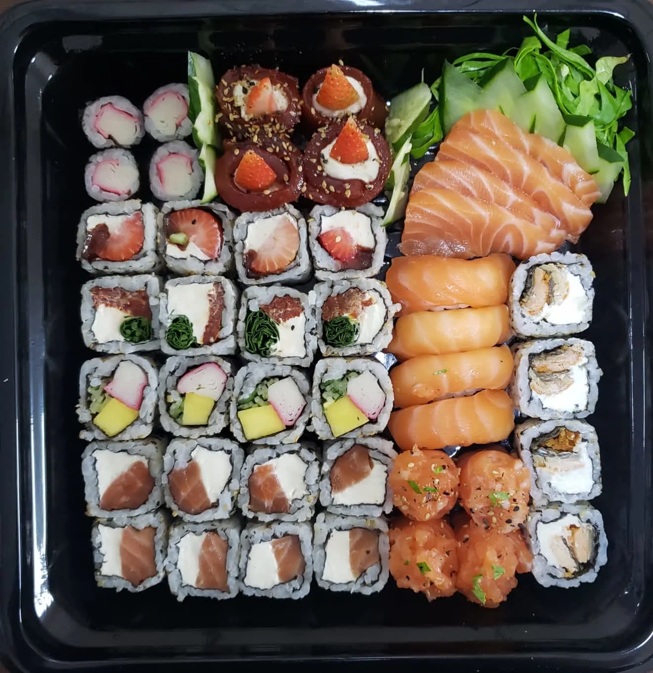 8 Uramaki Filadélfia, 4 Niguiri de Salmão, 4 Jow Salmão, 4 Sashimi de Salmão, 4 Kani Kama, 4 Uramaki Skin, 4 Uramaki Rúcula e Tomate Seco, 4 Uramaki Califórnia, 4 Romeu e Julieta, 4 Jow Goiabada. Acompanha: 6 sache de shoyo, 2 hashi, 2 nozoki